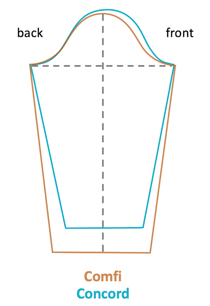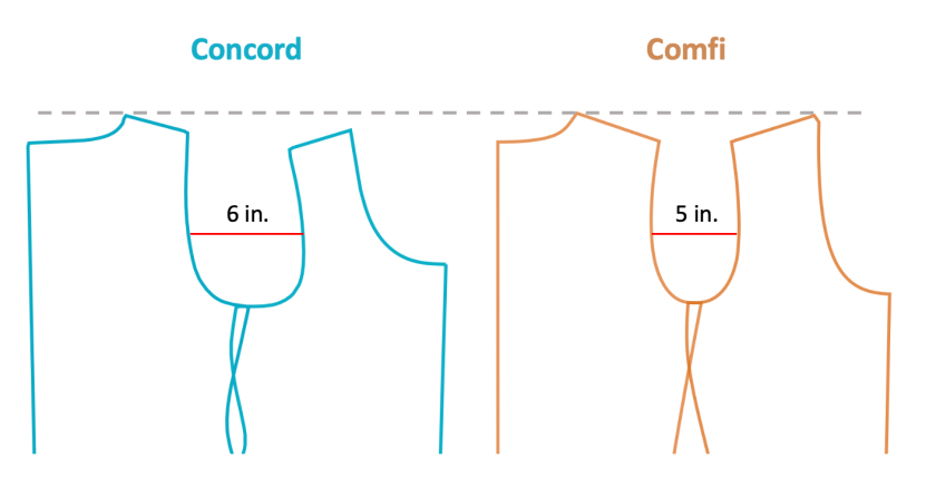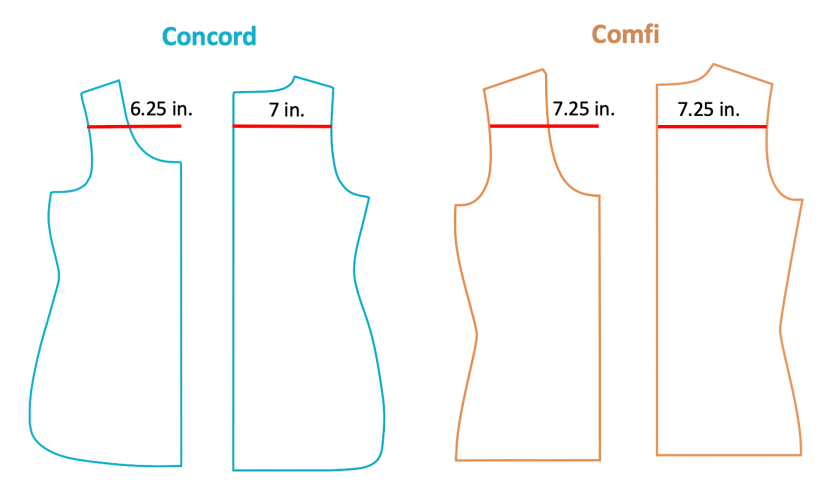 The shape of the front armhole curve is also very different. Concord has an asymmetrical armhole that is more scooped out in the front, forming more of an a L-shape. By comparison, Comfi’s armhole forms a symmetrical champagne glass shape that is 1 inch narrower.