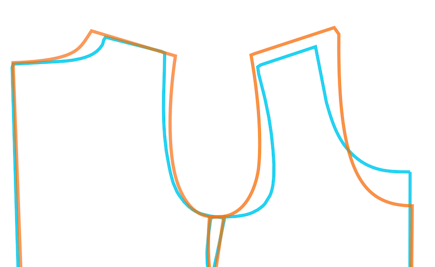 When I align both armhole curves on top of each other, you can also see that not only is Concord’s front shoulder shorter and narrower than Comfi’s, but it is also slightly more angled toward the back. If you imagine closing the shoulder seams on both patterns, Comfi’s shoulder seam will sit directly above the side seam while Concord’s will fall more forward on the body (to the right in the image above).