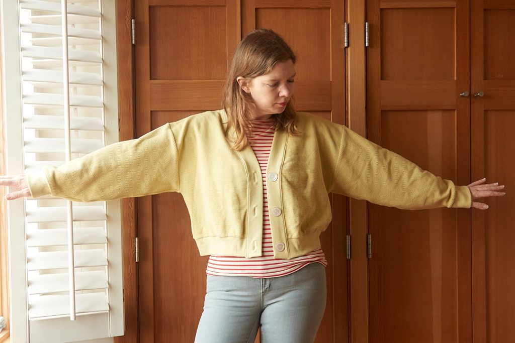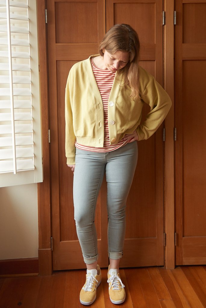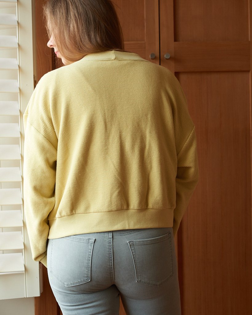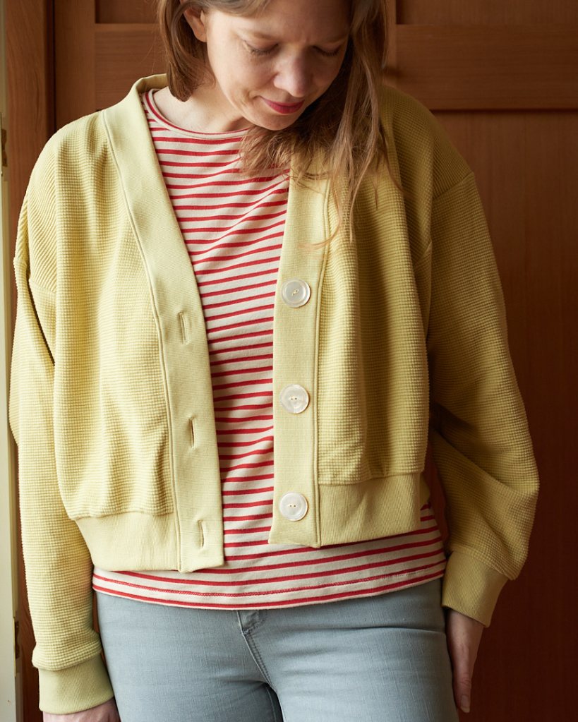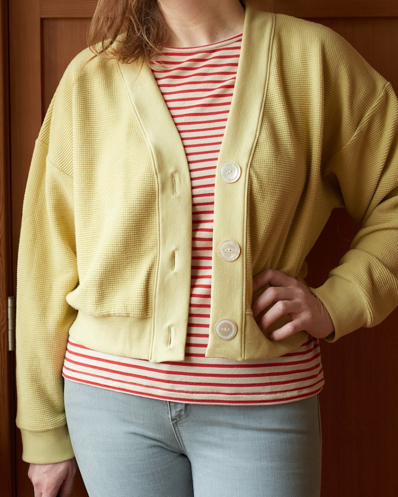 I’d been eyeing this lemongrass yellow waffle knit from a couple of different fabric shops, and when I saw how beautifully it sewed up into Sienna’s Marlo, I didn’t hesitate. This is the waffle knit and matching rib from Blackbird fabrics (now sold out), which has 5% spandex and a good 4-way stretch.