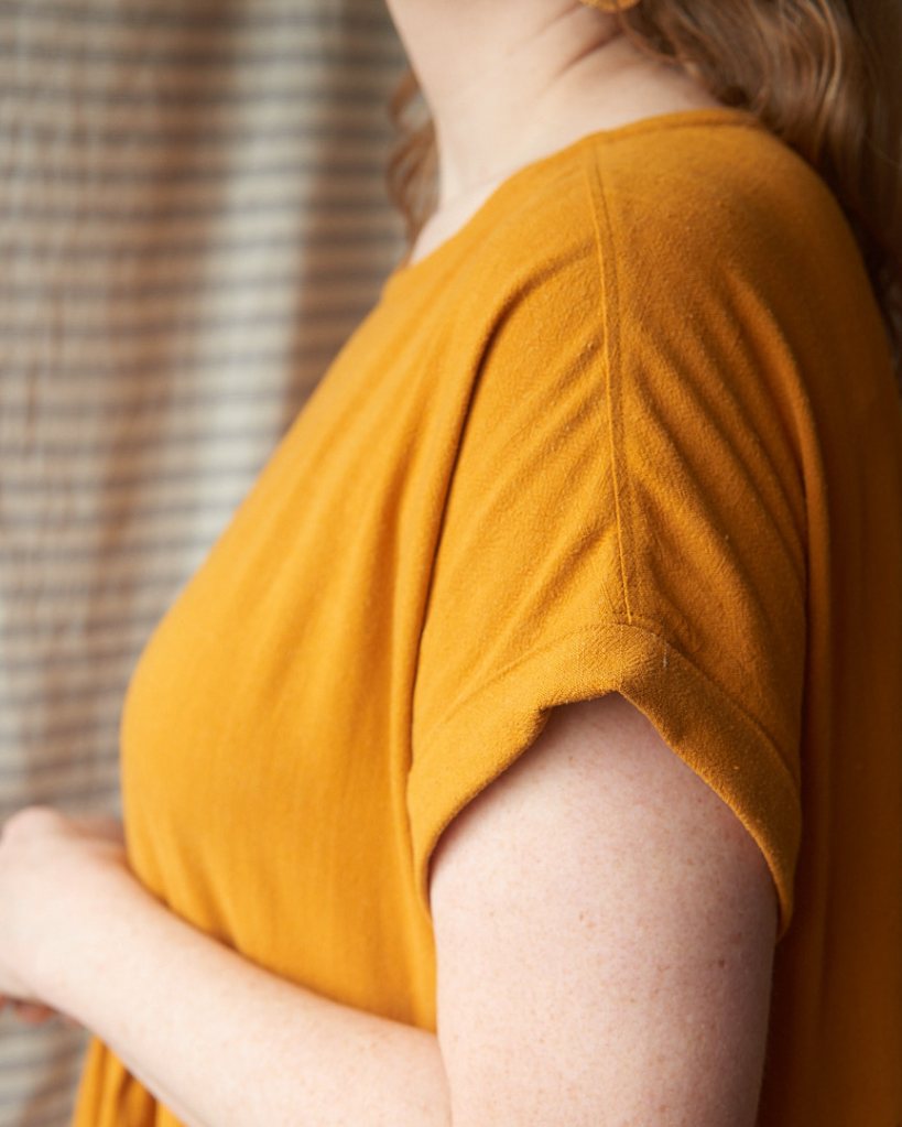 The ES Georgia tee is a boxy top, which means that the front and back pieces are almost identical. The front piece has 1/4 inch extra width in the center front compared to the back, which I think is intentional to create some room for the bust when the shoulder seams are joined.