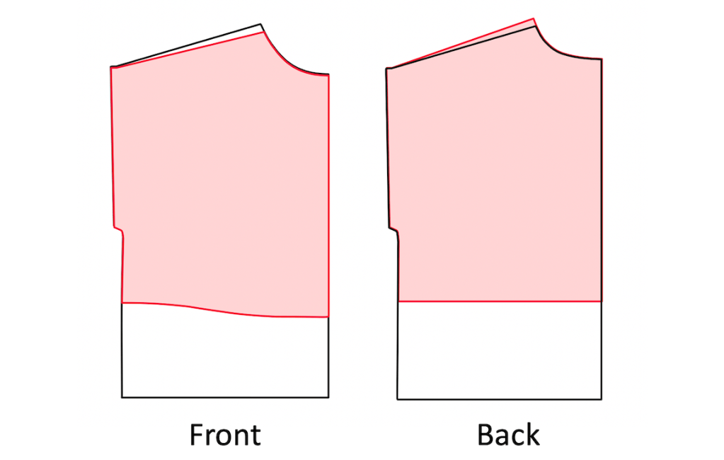 In addition to the forward shoulder adjustment, I also added 1/2 inch of length to the front bodice (see diagram above), tapering to nothing at the side seam. This extra fabric acts like a full bust adjustment, and gives me enough to cover my D+ cup chest while keeping the waist seam straight. Without this extra bit in front, the waist seam would be slightly curved like a frown because I need extra length in the front to accommodate my chest.
