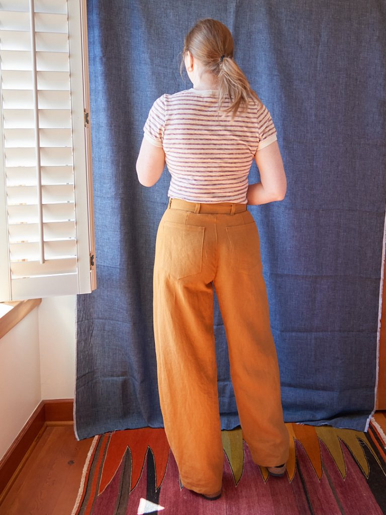 The Coe tester version did not come with a pocket stay, and on-seam trouser pockets like this are prone to gaping open like you see in my linen pair below. After chatting with Chelsea about this, I added a pocket stay on my second pair, as well as a small adjustment to the back dart. I’ll share more details in my next post on fitting.