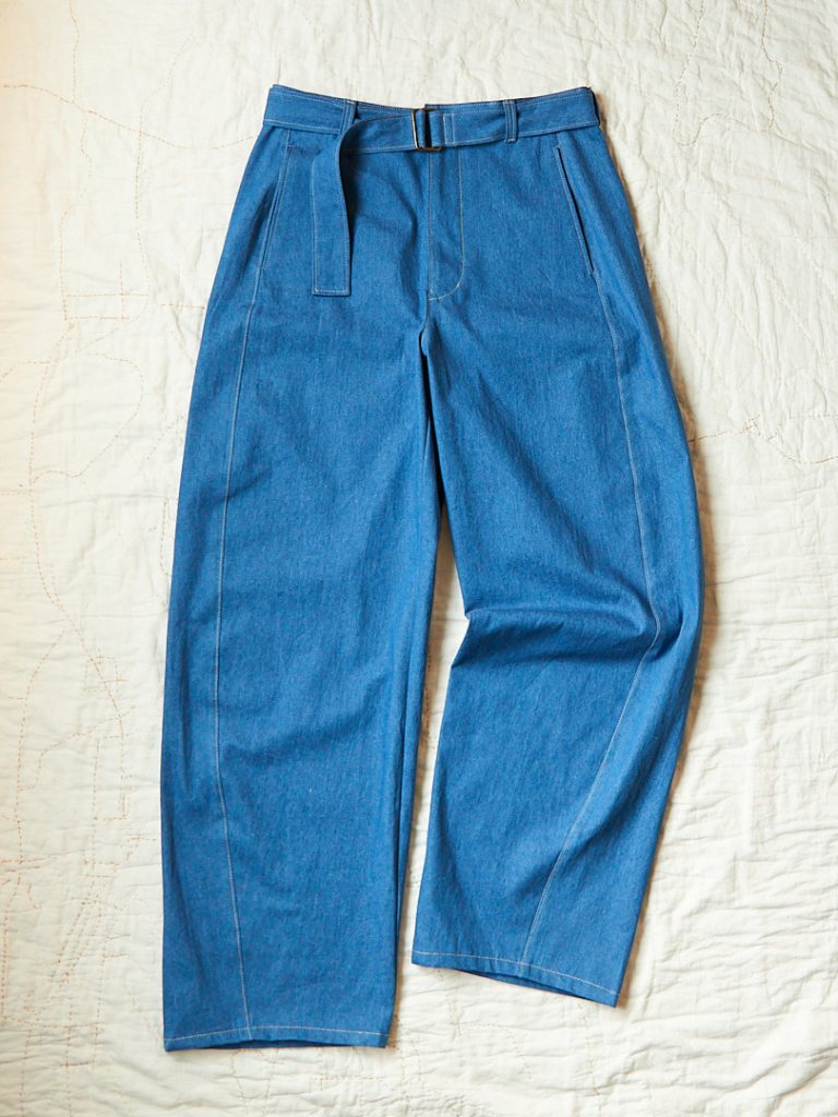 While each of these designs is slightly different in its own way, the side seam is moved more toward the front of the body, and it curves forward as it descends down the leg. The wide leg doesn’t hang straight down, but instead has a barrel shape, which complements the curved seam.