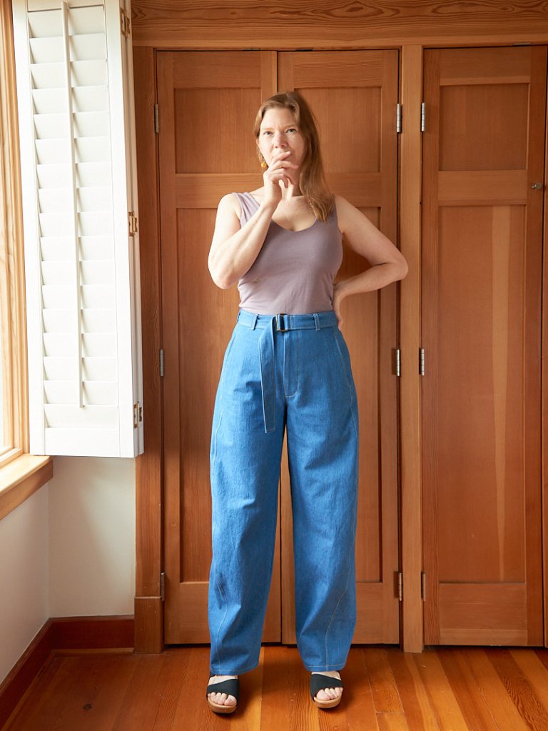 For my linen pair, I used a 6 oz linen from StoneMountain & Daughter. This linen has a lot of drape, so these pants feel very summery and breezy. The fabric in the leg feels very fluid when I walk, and the barrel leg shape of the leg is softened considerably. The linen also relaxes on the body, so these also feel slightly looser than the denim pair, which is not a bad thing in the summer heat. They are ridiculously comfortable.