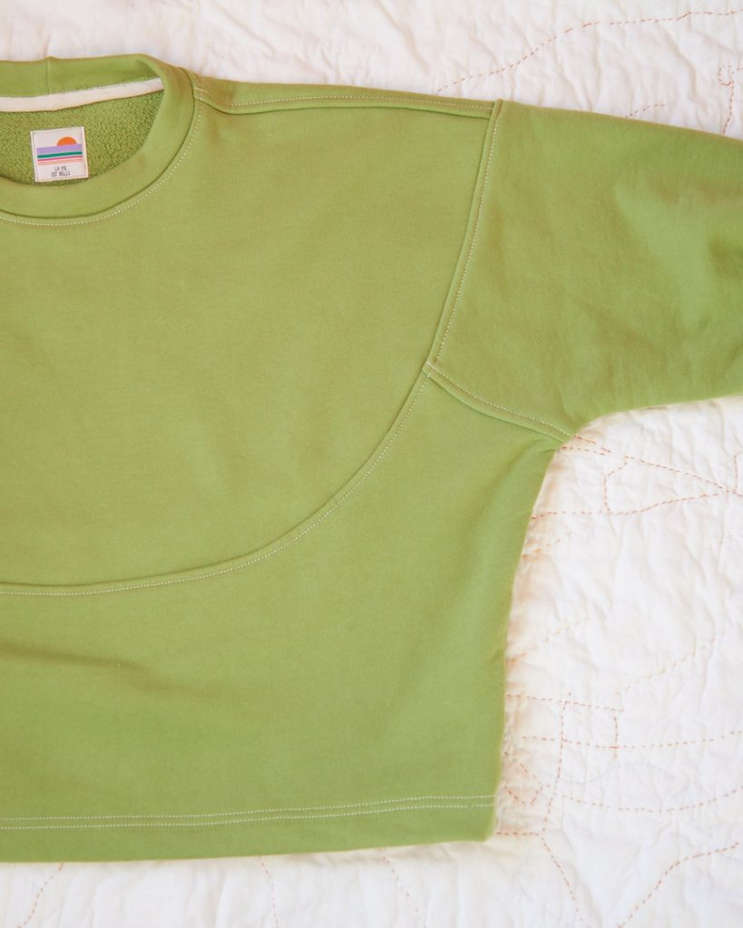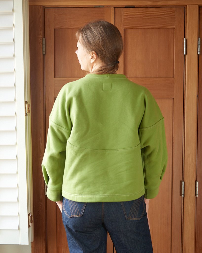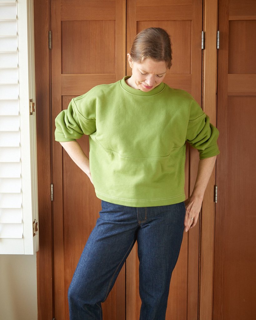 My favorite version is the apple green Wren (size L), which I made out of a heavyweight 100% cotton fleece. This fabric is a whopping 916 gsm, or 27 oz, which is THICK. I had to use my semi-industrial straight stitch machine to construct this garment because multiple layers simply would not fit under the presser foot of my serger.