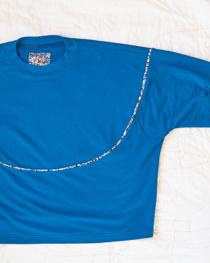 Switching the fabric alone resulted in my least favorite version of Wren. I made a second Wren using 270 gsm (8 oz) sweater knit, a popular weight for sweatshirting and less than a third of the weight of the first. It’s comfy for lounging but I don’t wear it out of the house. The lighter weight fabric doesn’t hold the volume as well, and the design is lost. Perfectly wearable, but it looses all of it’s character.