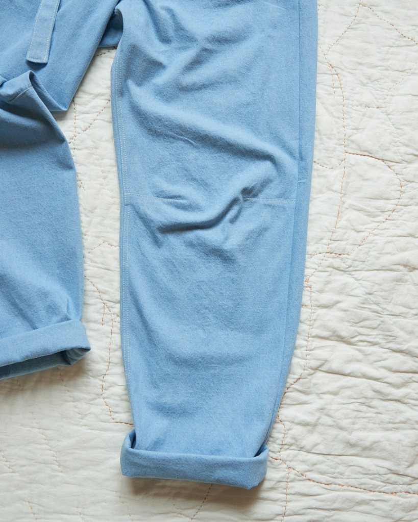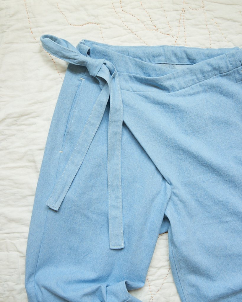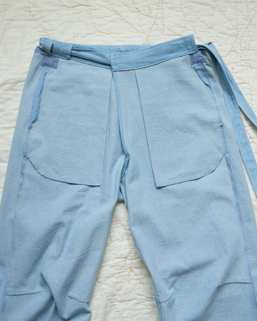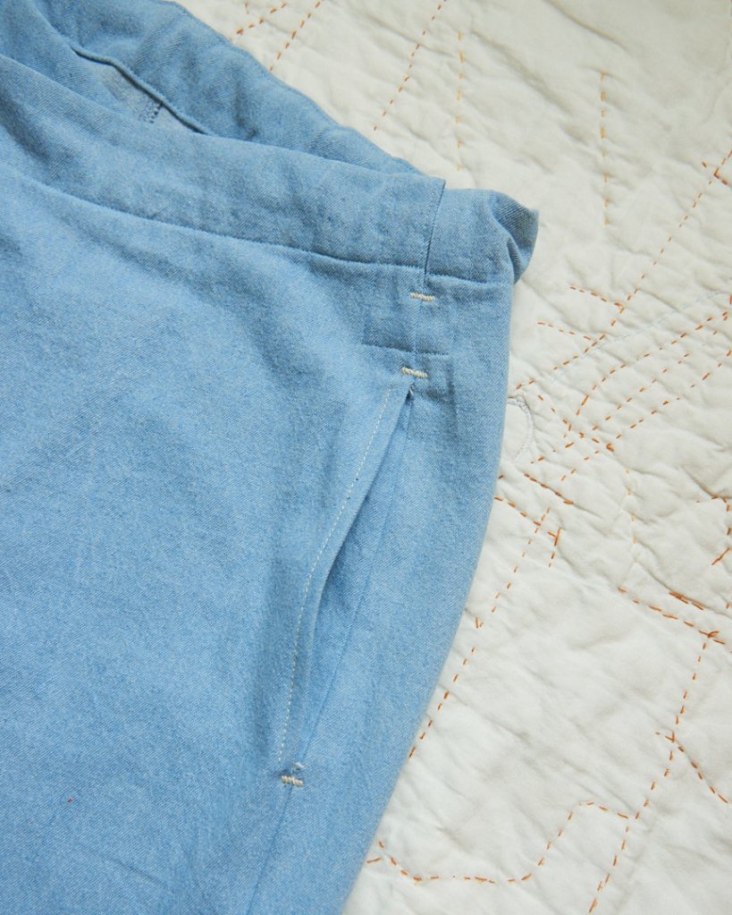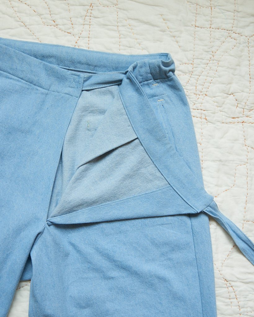 - The rest of the instructions are relatively straightforward from this point on. Add bartacks to the side slits, add the belt loop (if using), insert the tie through the back of the pants, and hem.