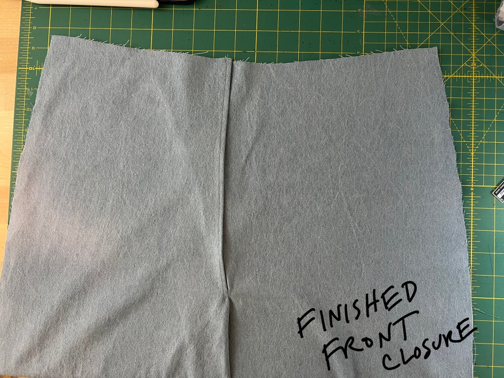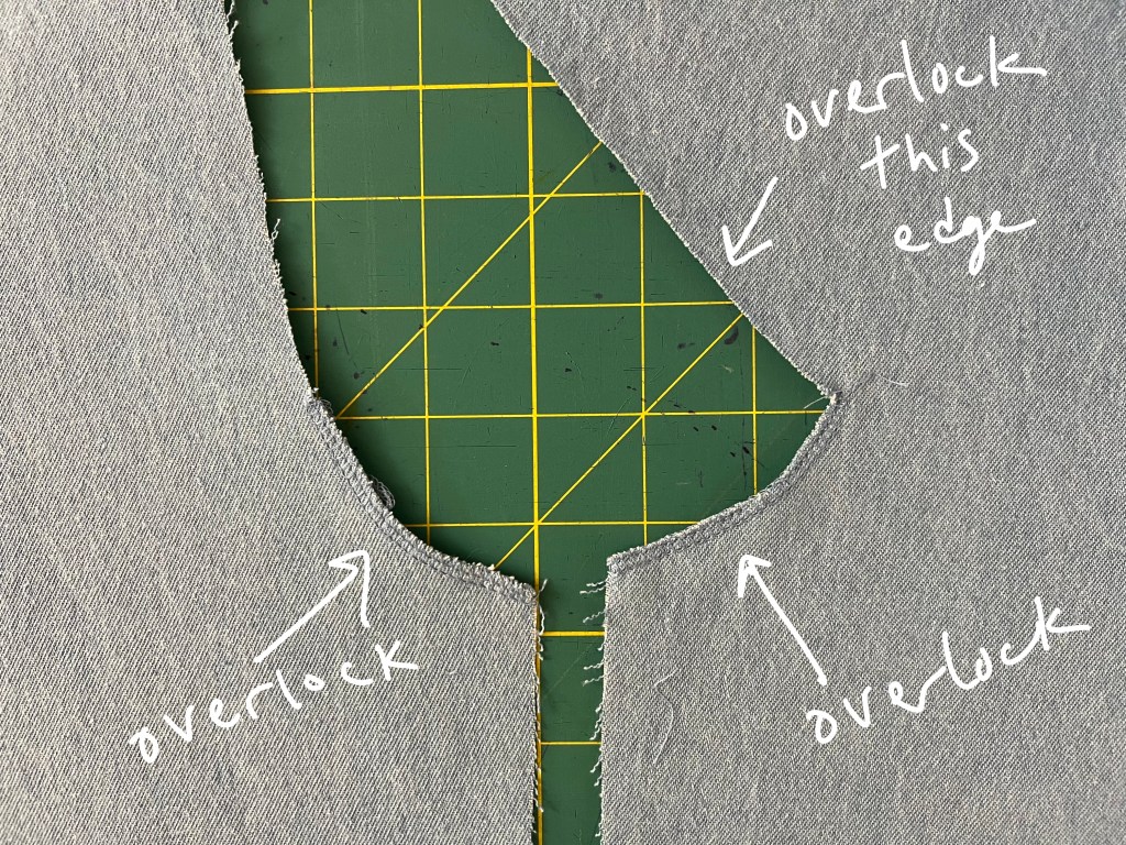 - Overlock the front crotch seams. I also added overlocking to the left front closure along the edge. This edge seems like it could get exposed in the wash, and I don’t want it to unravel.