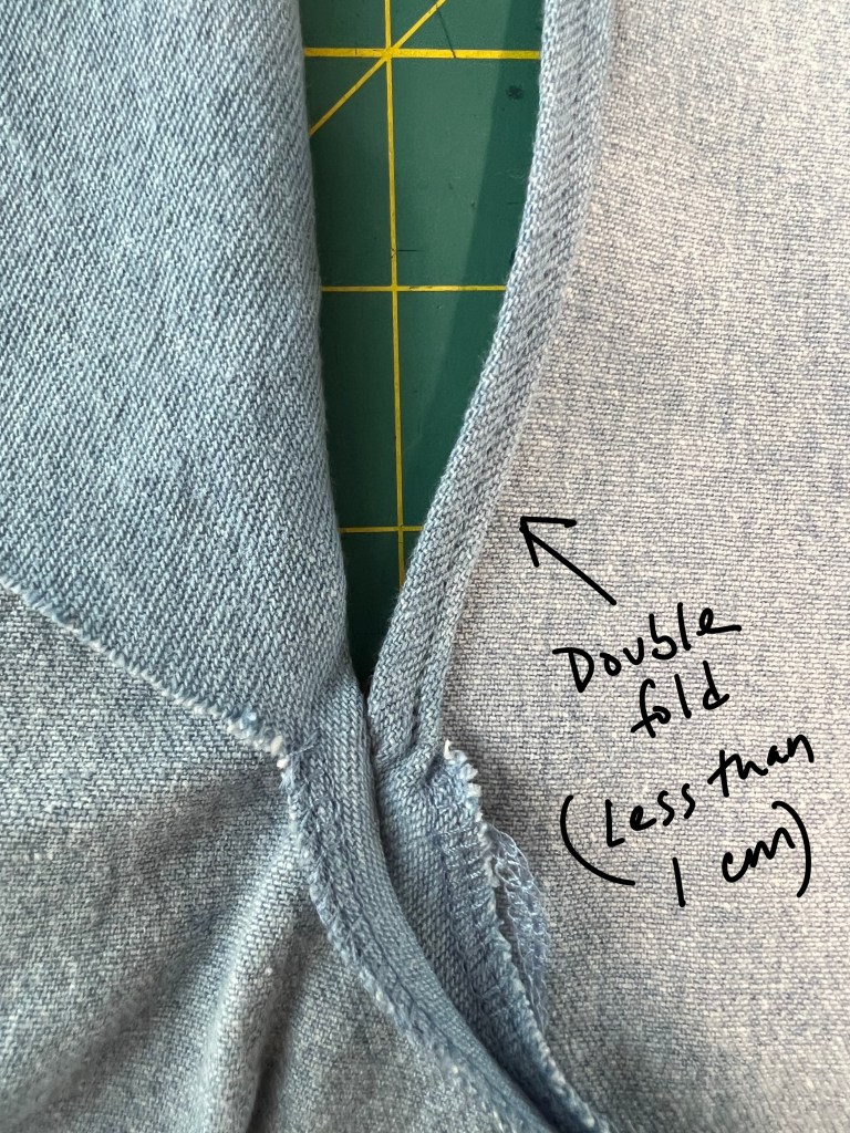 - I also added edge stitching after making the first fold. It might be overkill, but these stitches will hopefully keep the fold in place during washing and prevent the edge of the fabric from flipping out. These stitches are ONLY through the fold, they don’t show on the right side of the garment when worn.