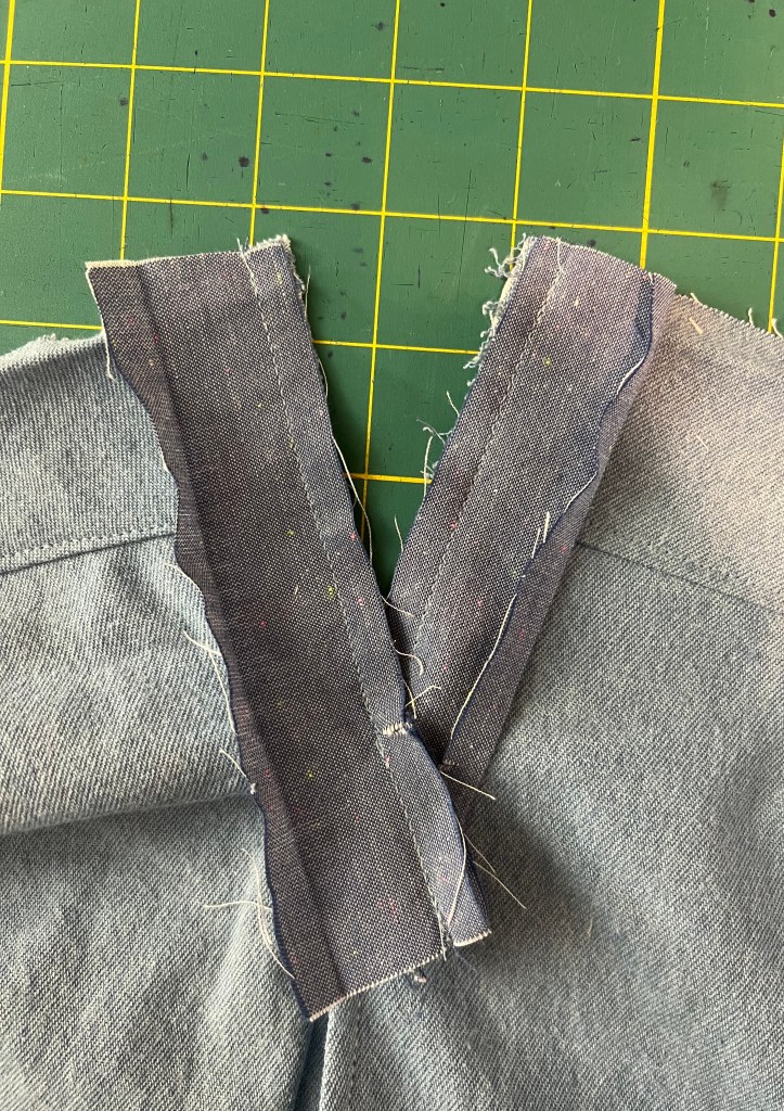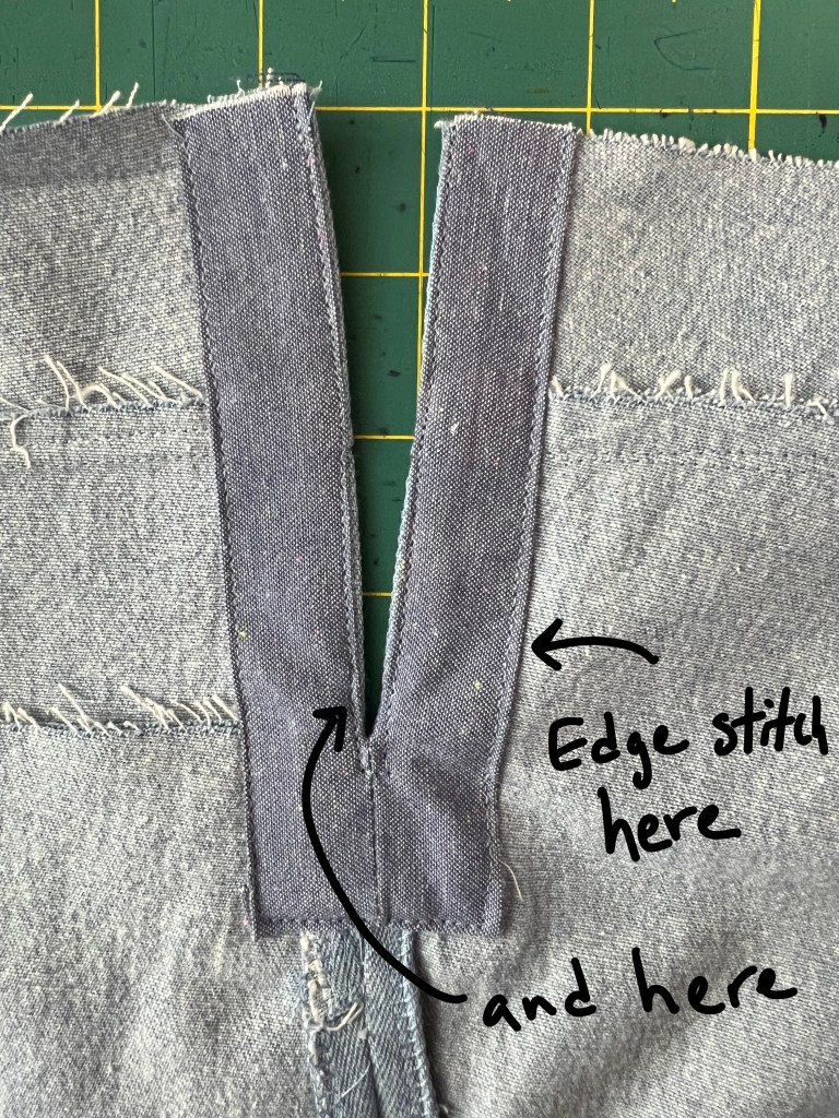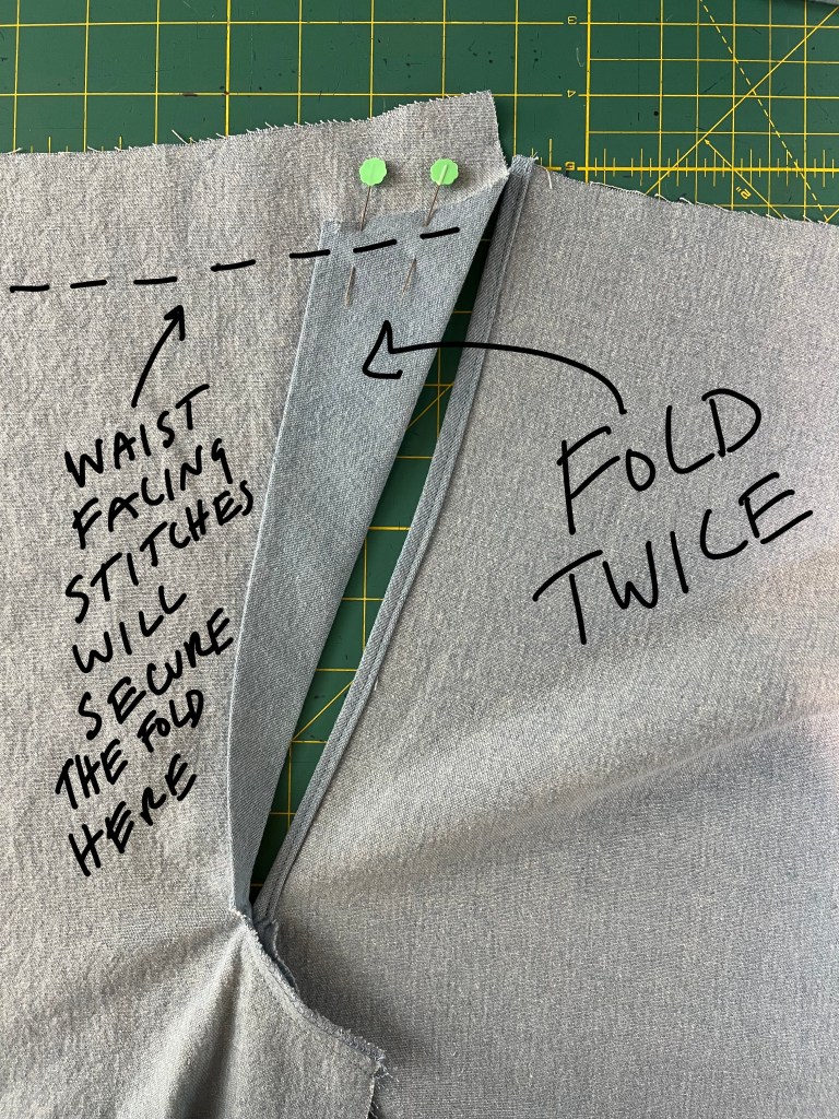 - Here is a photo from a few steps later, after I’ve closed the waist facing, but the edge stitching for the side slit facing only goes through the little side facing channel and NOT the longer left waist facing. If your stitching goes through both facings here, you will be closing this little channel and you won’t be able to get your waist tie through it.