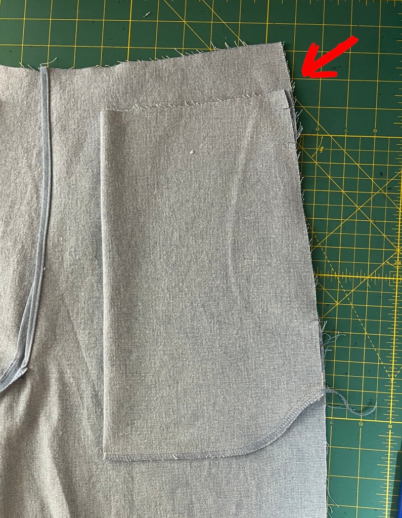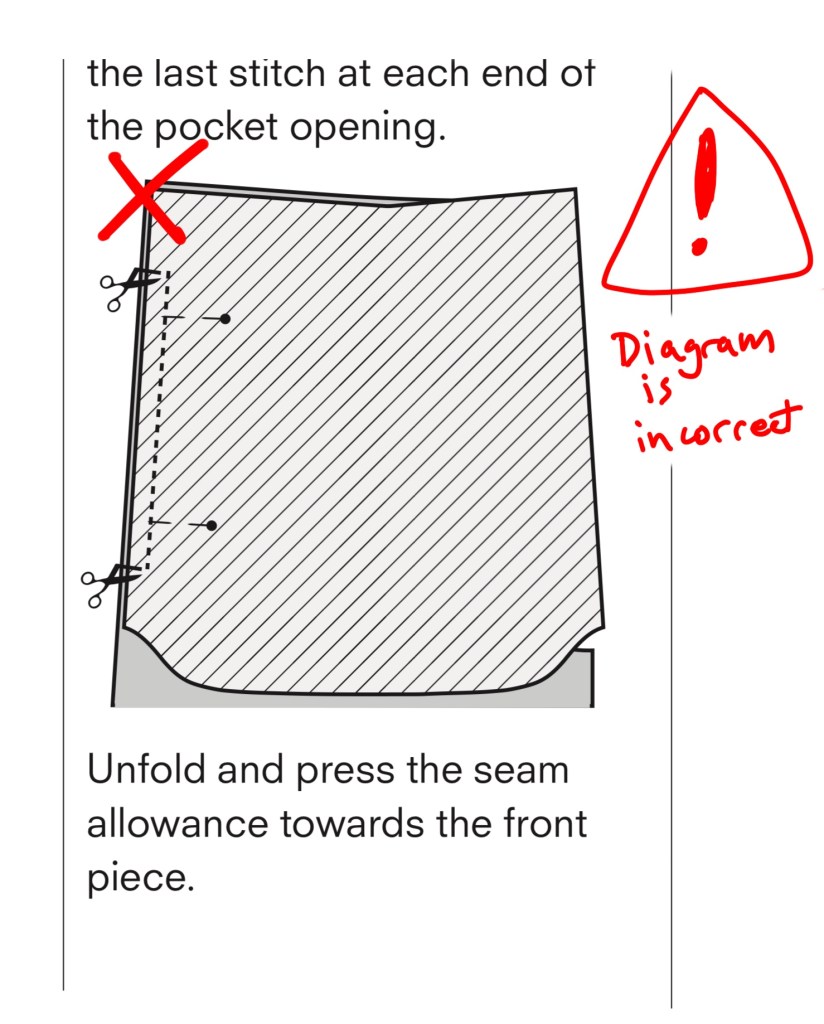 - AR’s written instructions for attaching the pockets are pretty good, but the diagram that accompanies this section is incorrect. The top of the pocket bag should sit several cm below the top edge of the front leg, use the notches for the pocket opening to align both pieces.