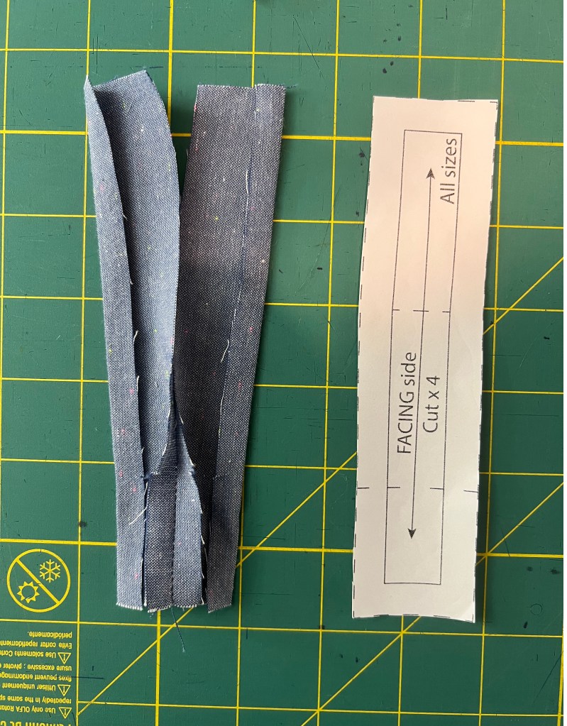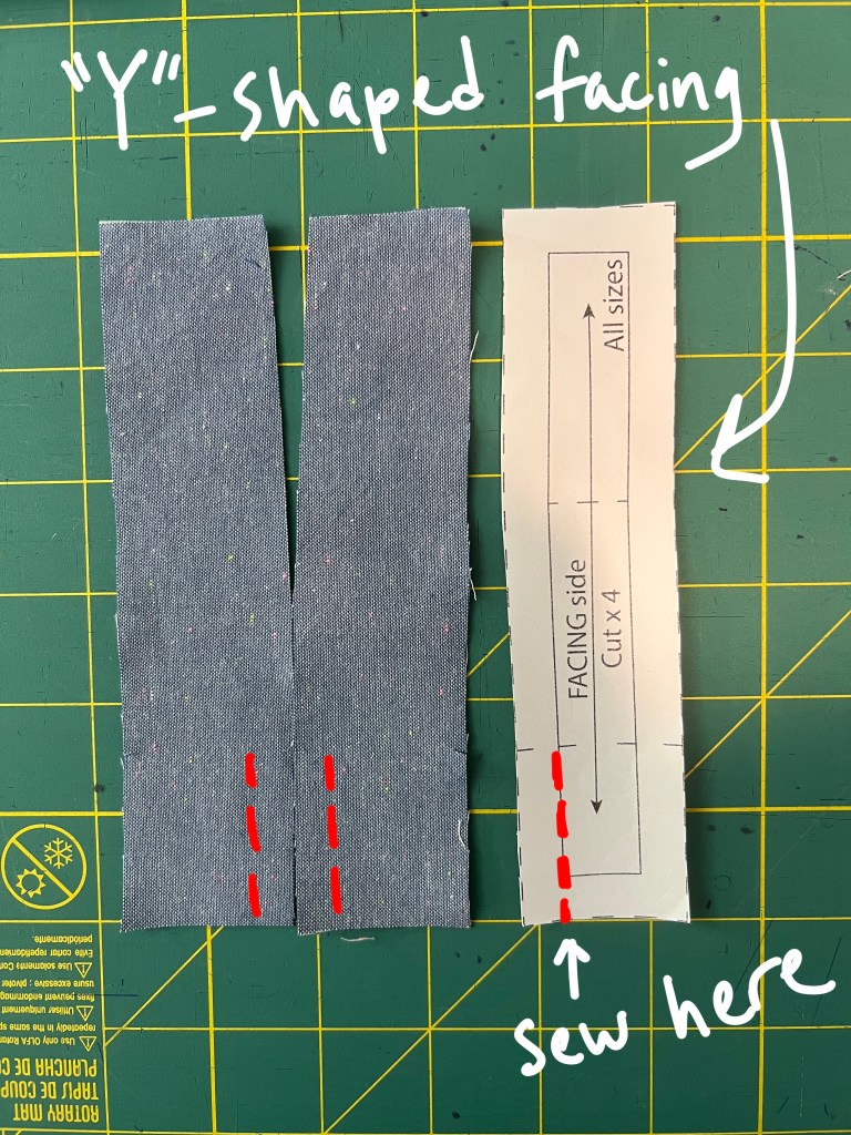 - There are 4 side slit facings and they are DIRECTIONAL. The instructions illustrate the side slit facing as a rectangle (step 6a), but this is misleading. There is a correct orientation that you need to follow for best results. You join 2 facing pieces to make a “Y” shaped facing for each side of the trousers: