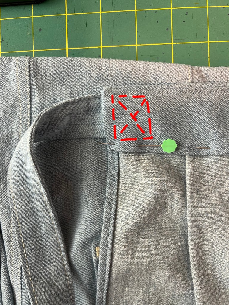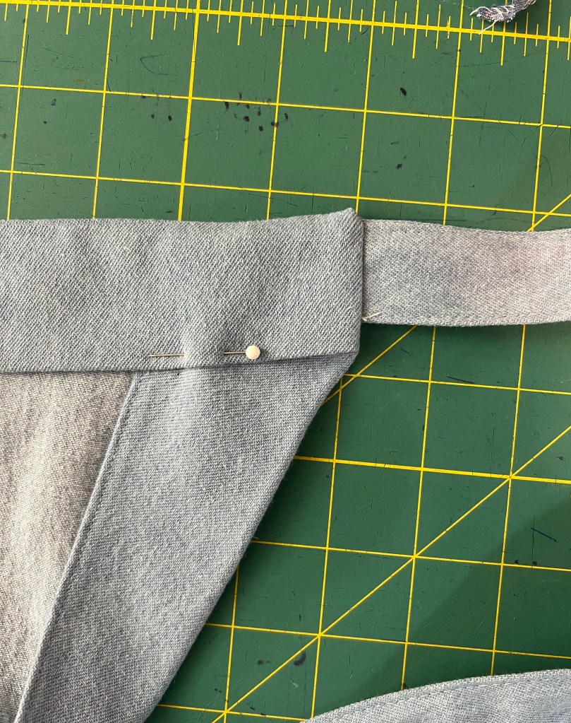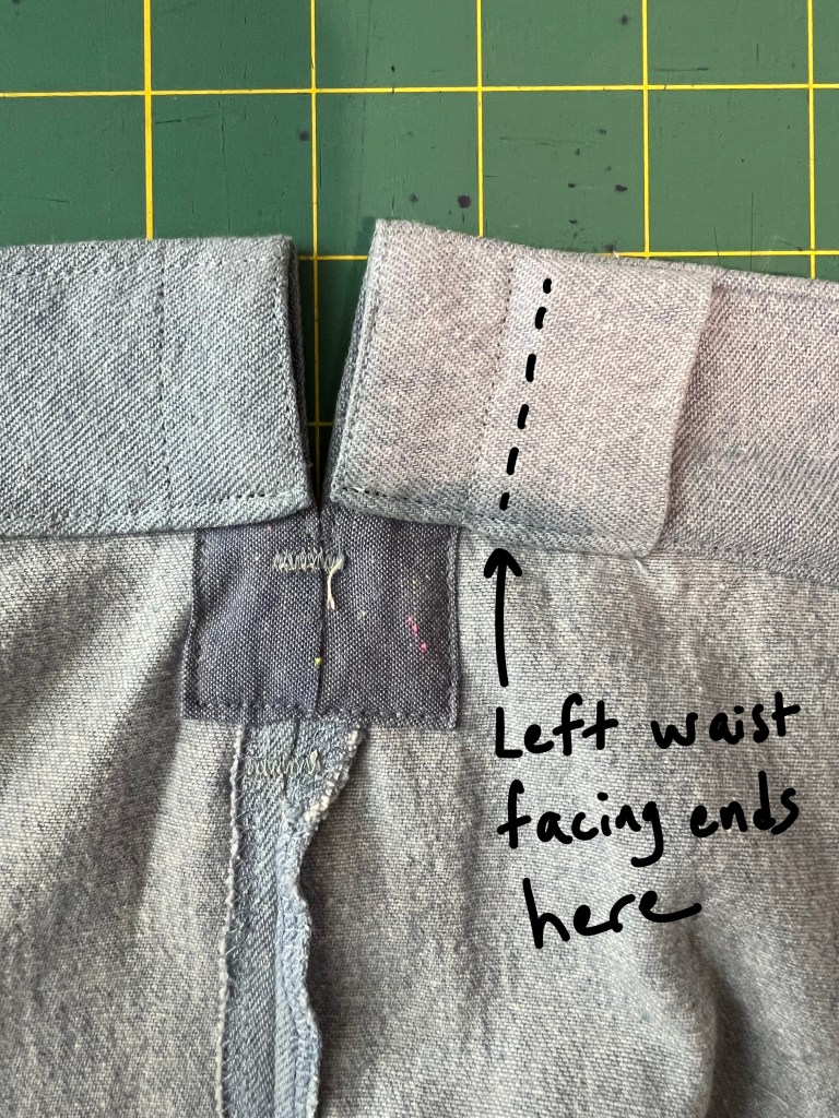 - Technically there are two facings that will be applied to the left front: a smaller facing that creates this little channel for the belt AND a separate, longer facing that will finish the top edge of the pants. This is what you are aiming for as you sew the top edge of the waist facings to the pants: