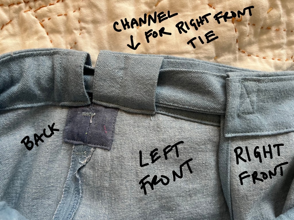 - The instructions direct you to do the same procedure to enclose the right side waist tie. However, if you follow those instructions, you will create a weird jog in the front of the pants, because the entire length of the front right side has already been finished. I ignored the instructions here and inserted the tie into the channel and top stitched to secure.