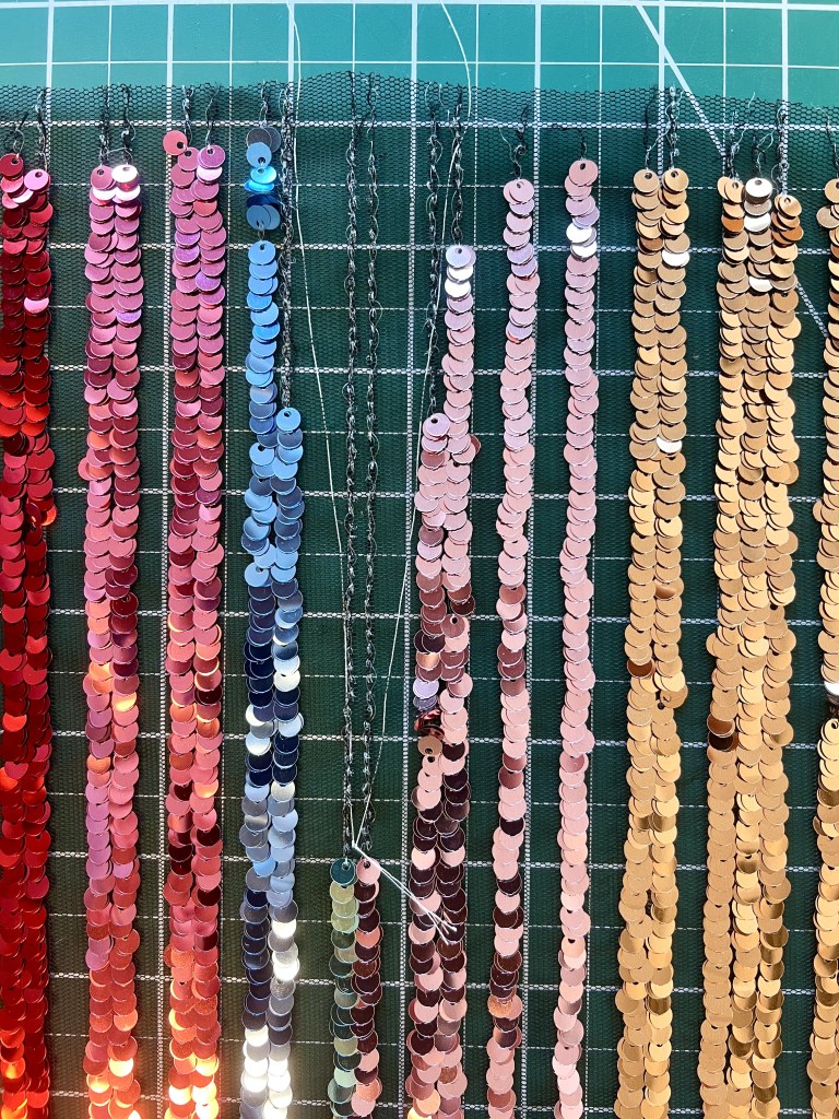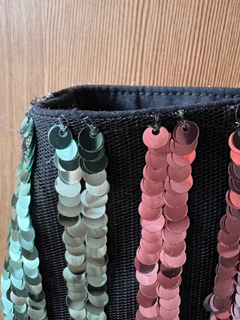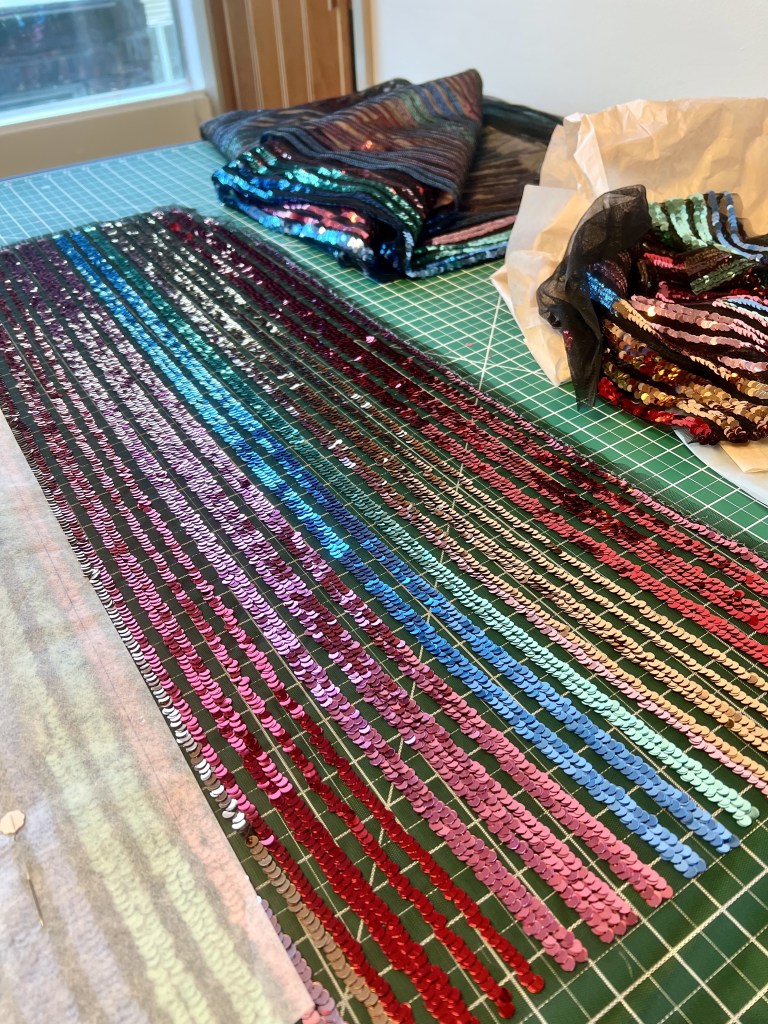 Once I finished the skirt construction, I also decided to reinforce all of the sequins along the top edge of the skirt, as over time I figured they might be subject to more abrasion and wear, and they may get pulled off more easily than the rest of the sequins. I went around the top edge with black thread and knotted each sequin in place.