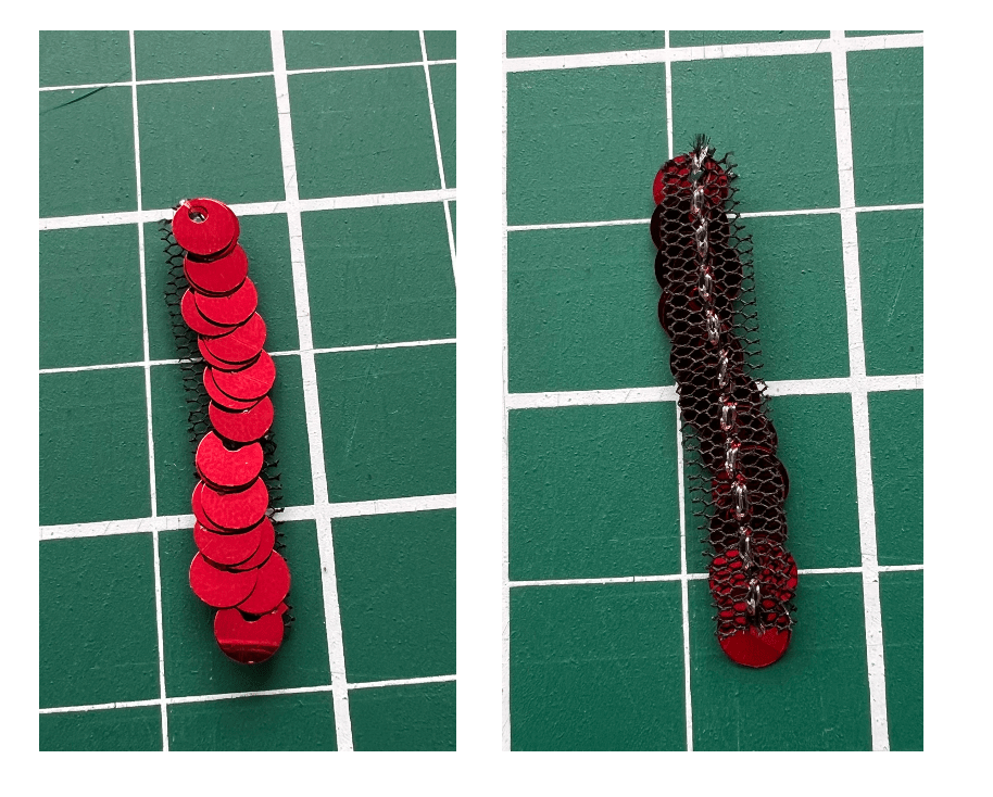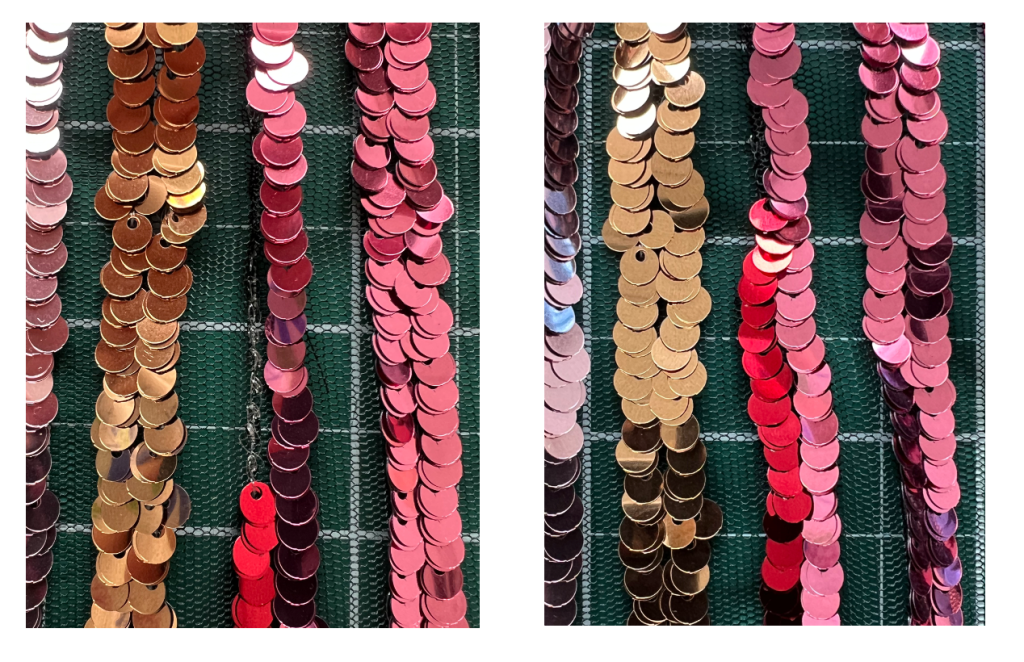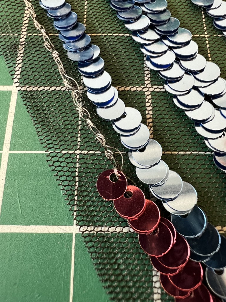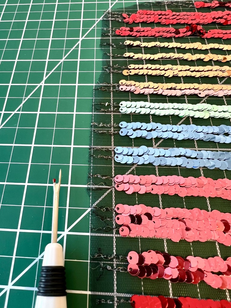 For the second dart, I tried a different method for adding back sequins. Below, I cut out a row of sequins and their mesh substrate to make a graft. The sequins are so securely locked in place that they do not come off after cutting out a little section like this. I then sewed this little strip onto the bare patch on the dart. This worked much better, retained the right tension for the sequins to lay flat, and was faster than sewing individual sequins by hand.