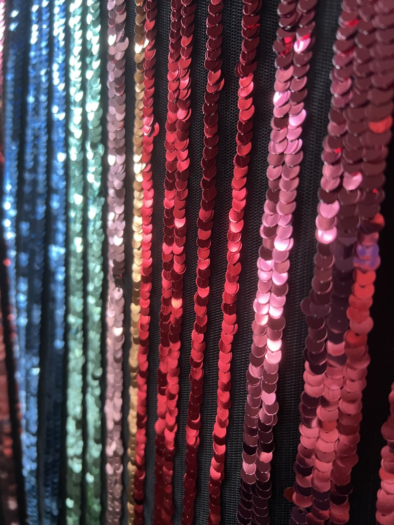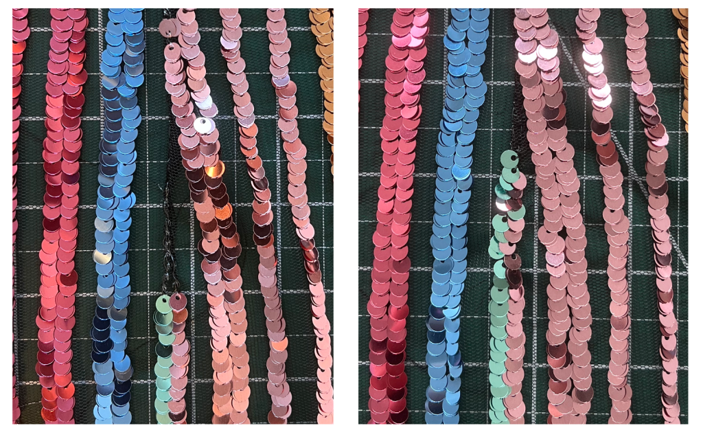 After sewing the darts, I decided to add back some of the sequins to cover the bald spots that were left behind. My first attempt is below, I added back a small row of sequins by hand, sewing each sequin individually. This was challenging because you need to get the thread tension just right to have the sequins lay flat and in a straight line. It is also very time consuming.