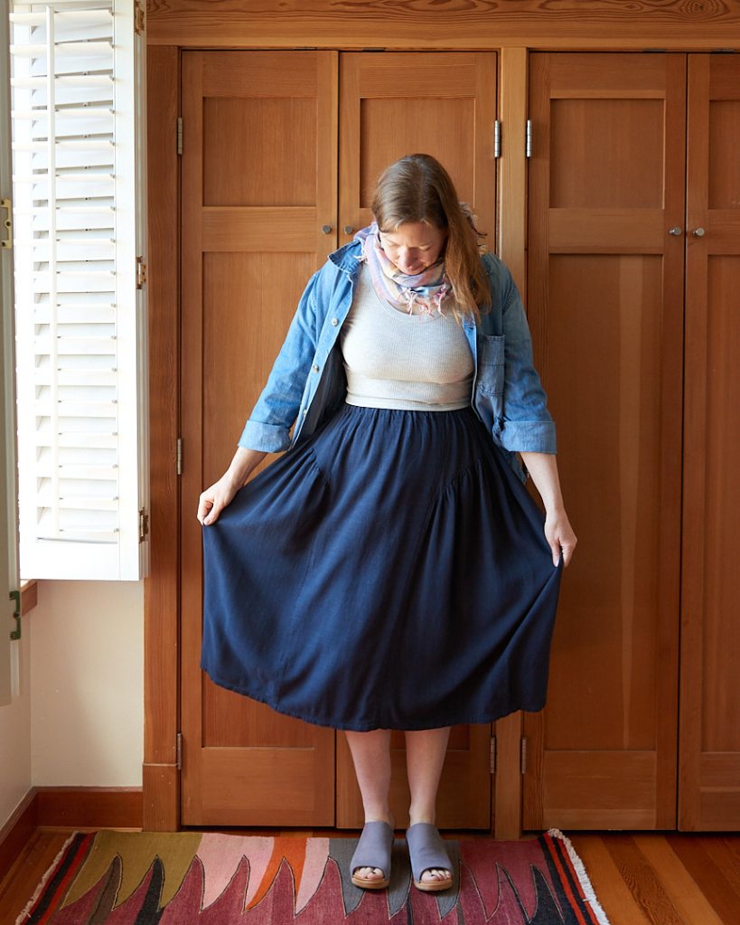 The hem binding is much lighter weight than a double fold, and the result is a beautifully drapey skirt that’s comfortable and fun to wear.