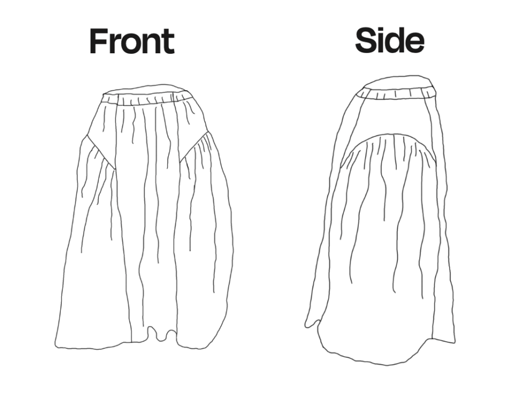 I don’t like the feeling of too much volume in skirts, so I chose a 6.5oz rayon/linen blend for a drapey, soft silhouette. This fabric is very swishy due to the rayon, but it also has some weight and bounce from the linen. Importantly, the hip gathers are softened so the silhouette is more subtle.