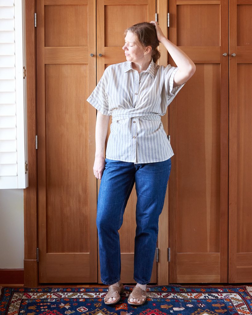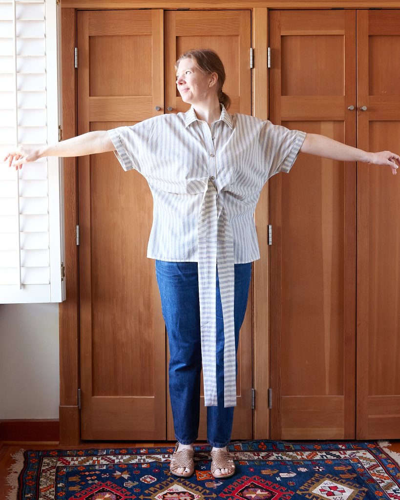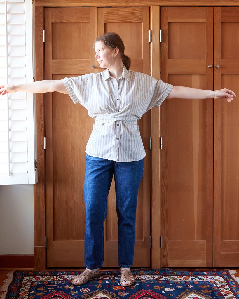 When untied, the Townsend fit is VERY relaxed through the shoulders and chest. I knew this was not a fitted top but I was a bit surprised at just how much volume there is. I have a 39” bust so I am a size E. According to the size chart, I should have 8 inches of positive ease in the chest, but it feels like more than that since my bust is in-line with the large sleeve openings. I’m not exactly sure how the 8” of ease is being estimated here.