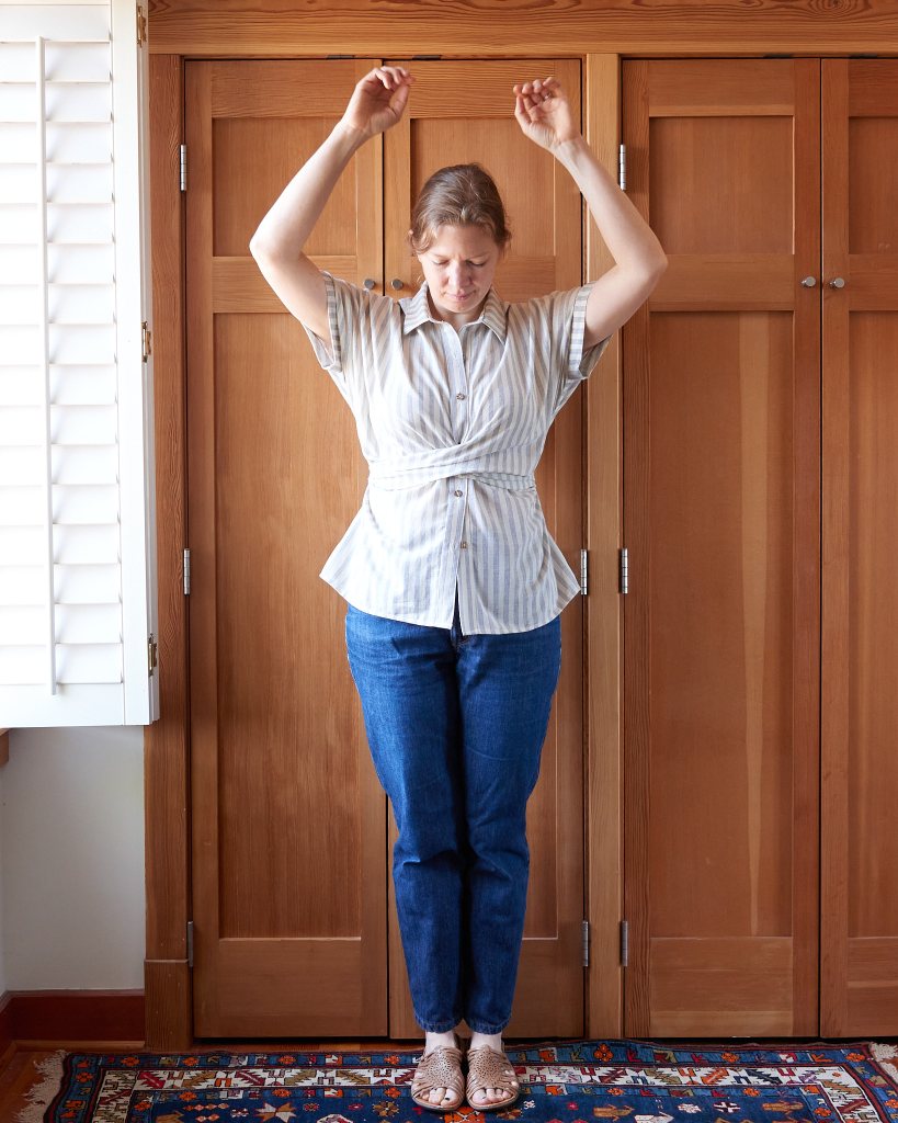 The second consequence of the loose arm opening is that the whole top gets pulled up and out of the waist tie when I raise my arms past 45 degrees. So after wearing this shirt for a day, I found had to re-adjust the bodice under the tie fairly often if I was being more active. If I pinch out width in the bodice to bring the armhole closer to the body, this issue improves, but it alters the “look” and silhouette of the top, so I will probably not change anything for subsequent Townsends.