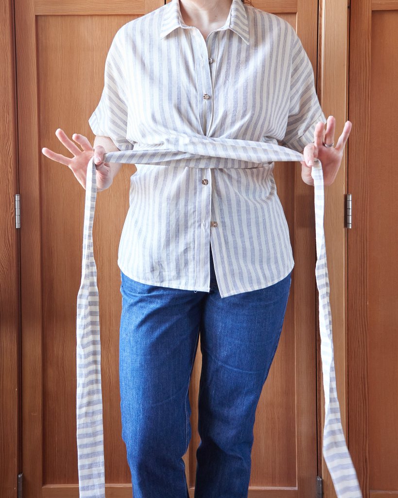 Despite the voluminous feel of the shirt when untied, everything cinches down once the tie is wrapped and secured. The top completely transforms when tied, and I really like the final look of the defined waist with the looser chest/shoulders.