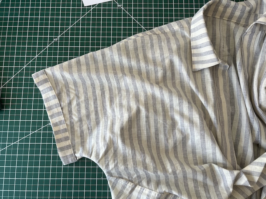 The Townsend sleeves are also quite long. Originally they were elbow length on me, and I am 5’10” with long arms. I ended up taking some length out of the sleeve by attaching the facing on the inside of the sleeve as directed in the instructions, but then folding it again to the outside of the shirt and sewing it down. This effectively shortened the sleeve by about 1.25″, and as a bonus now my facing with contrast stripes is visible on the outside.