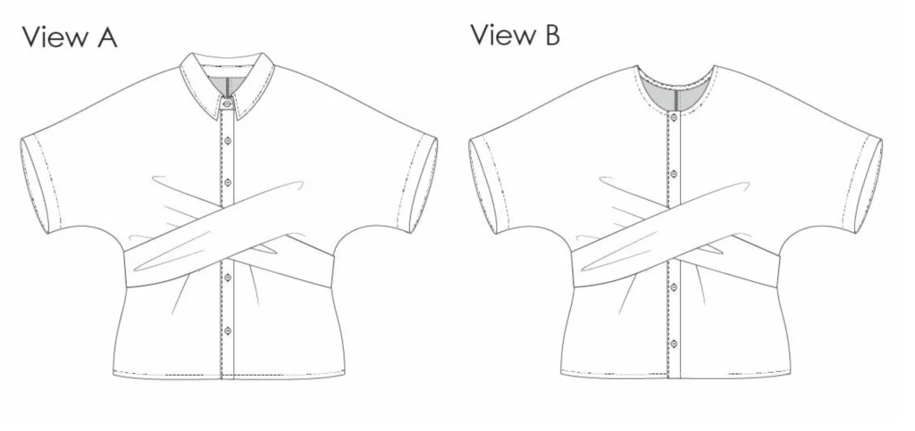 Townsend goes up to a 57 inch (144cm) bust, and unlike Elbe Textiles’ other patterns, it does not offer multiple cup sizes. The shirt has a generous amount of ease in the bust, so most cup sizes should be accommodated by the draft. Elbe Textiles has a blog post on modifying the bust ease if needed.