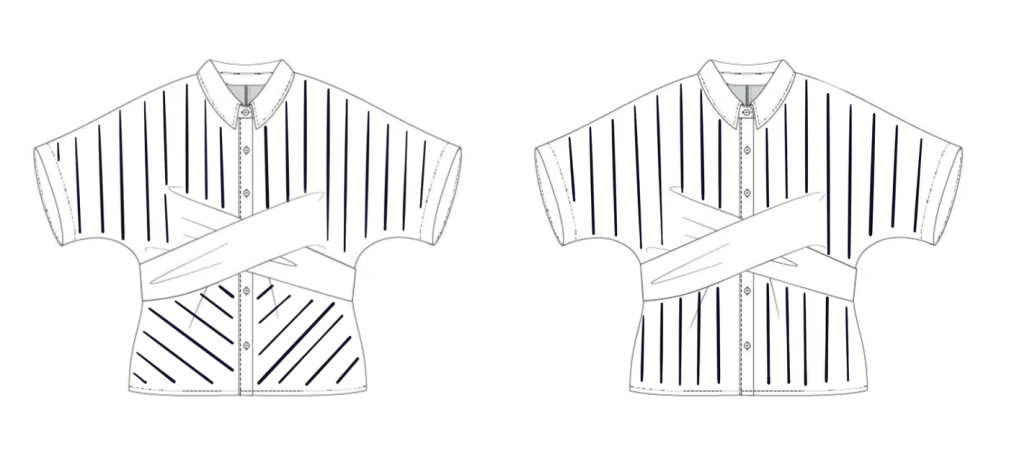 While this is a cool design feature seen elsewhere in ready-to-wear clothing, it was not the look that I wanted for my Townsend. I wanted vertical stripes from neck to hemline (below, right).